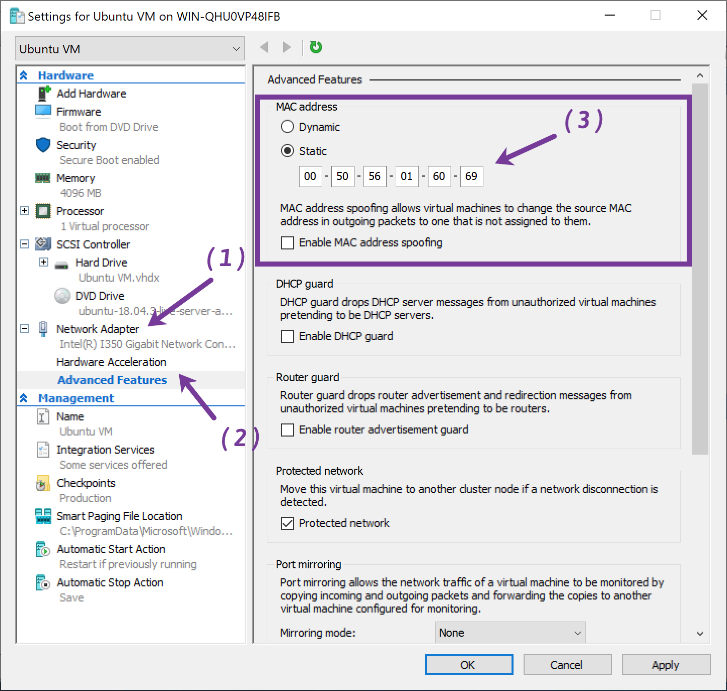 - Click Network Adapter (1), Advanced Features (2), then on Static in the MAC Address section. Enter the virtual MAC address of the failover IP in the form and validate by clicking on Apply, then OK to leave the settings window.