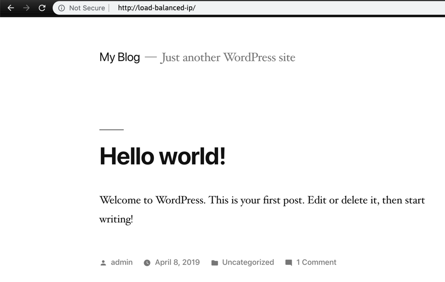Type the Load Balancer's public (flexible) IP address or your domain name in your browser, and WordPress will appear :