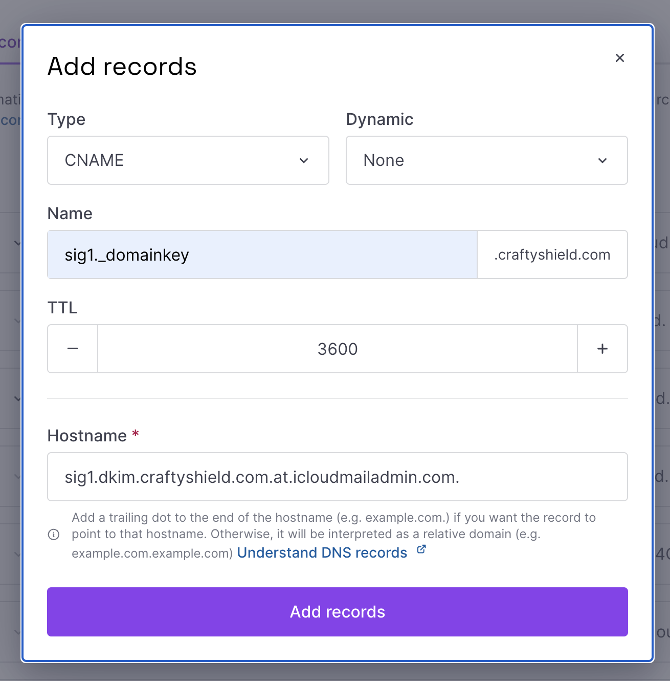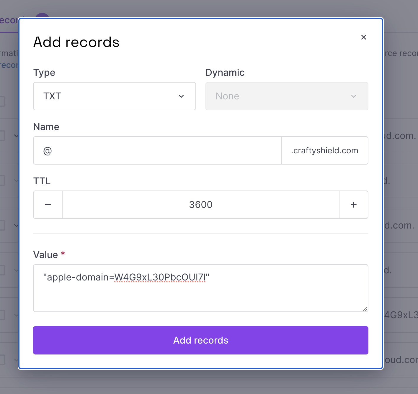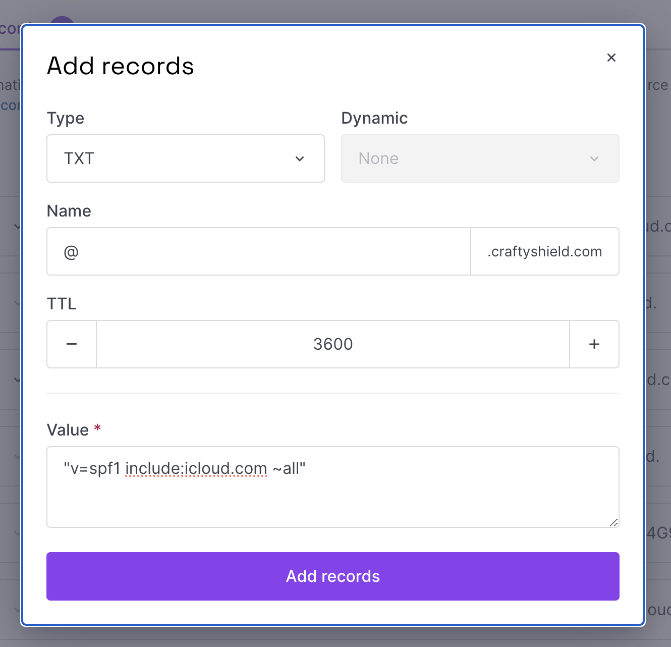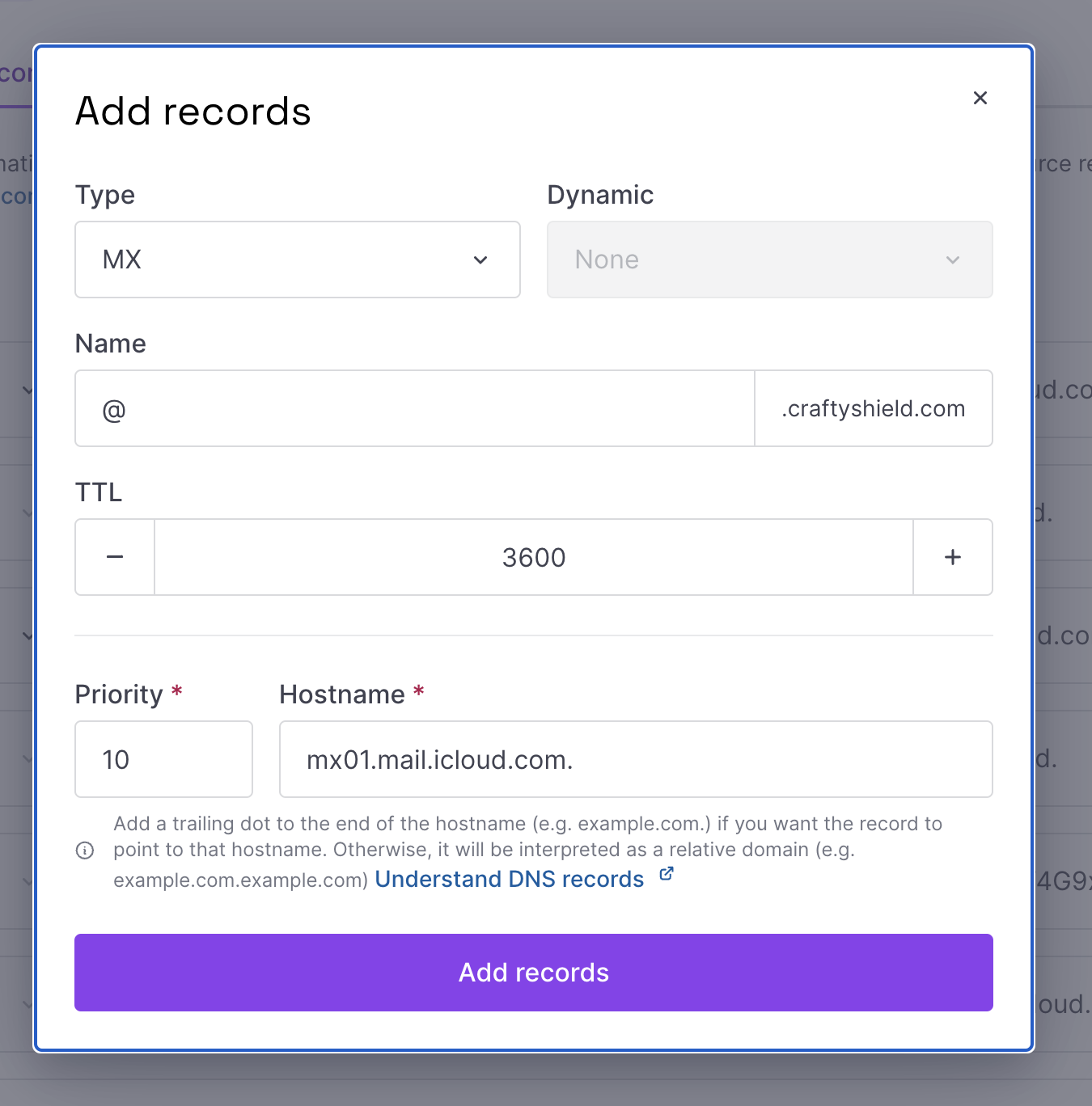 - Click Add records. We will add all records provided by iCloud. Adding all records is mandatory for the setup to work.