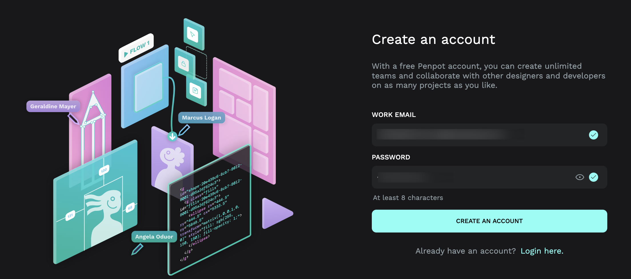 - Enter a name and click Create an account again to confirm. The Penpot dashboard displays. You can now start designing your assets.