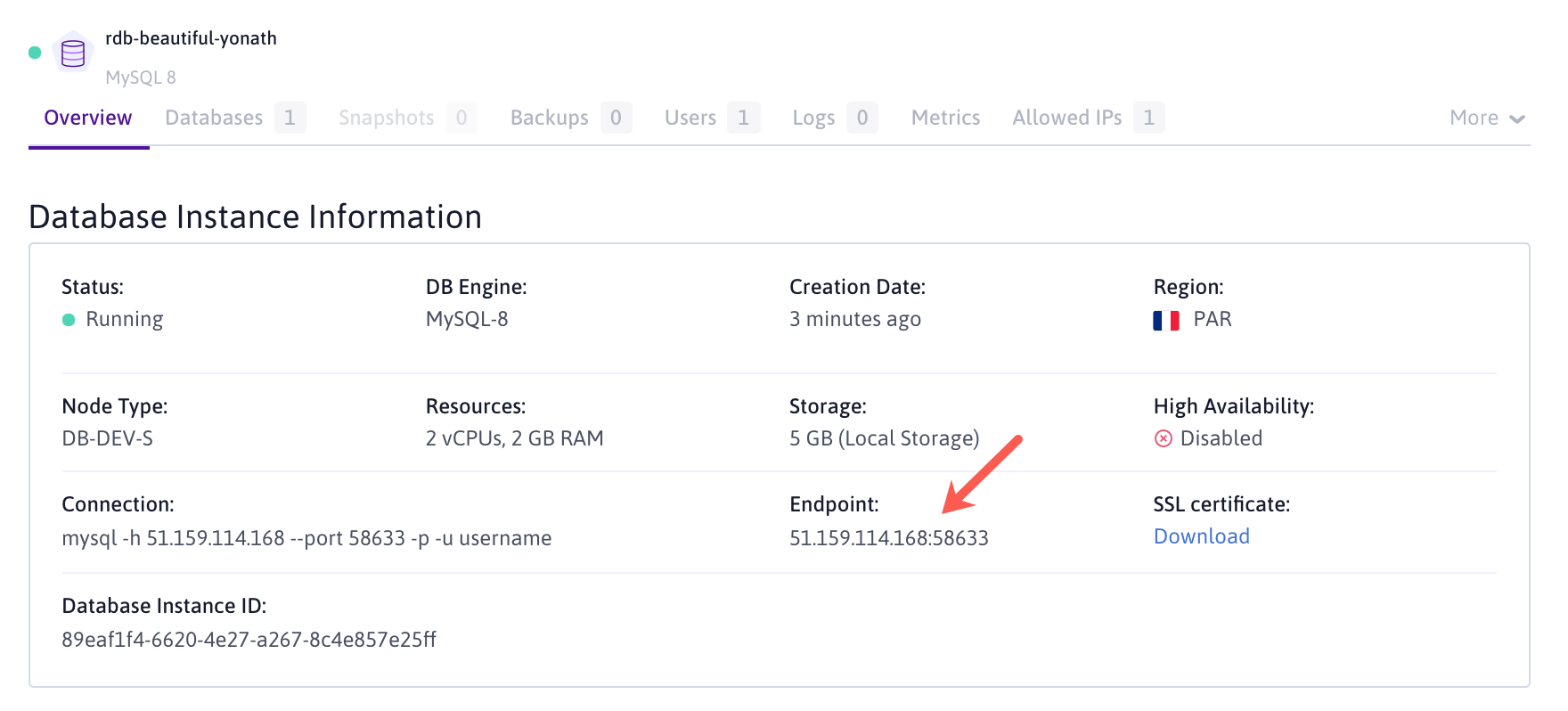 - Click Create Instance to launch its creation. Once the Instance is ready, you are redirected to its information page.