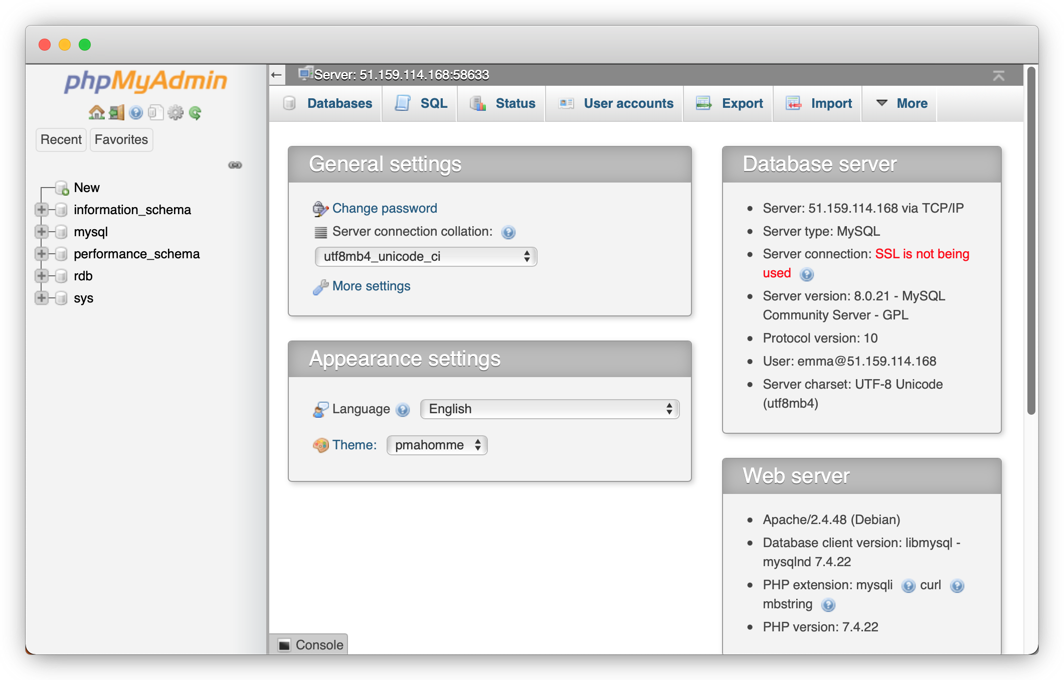 You can now manage your MySQL databases using the graphical interface of phpMyAdmin.