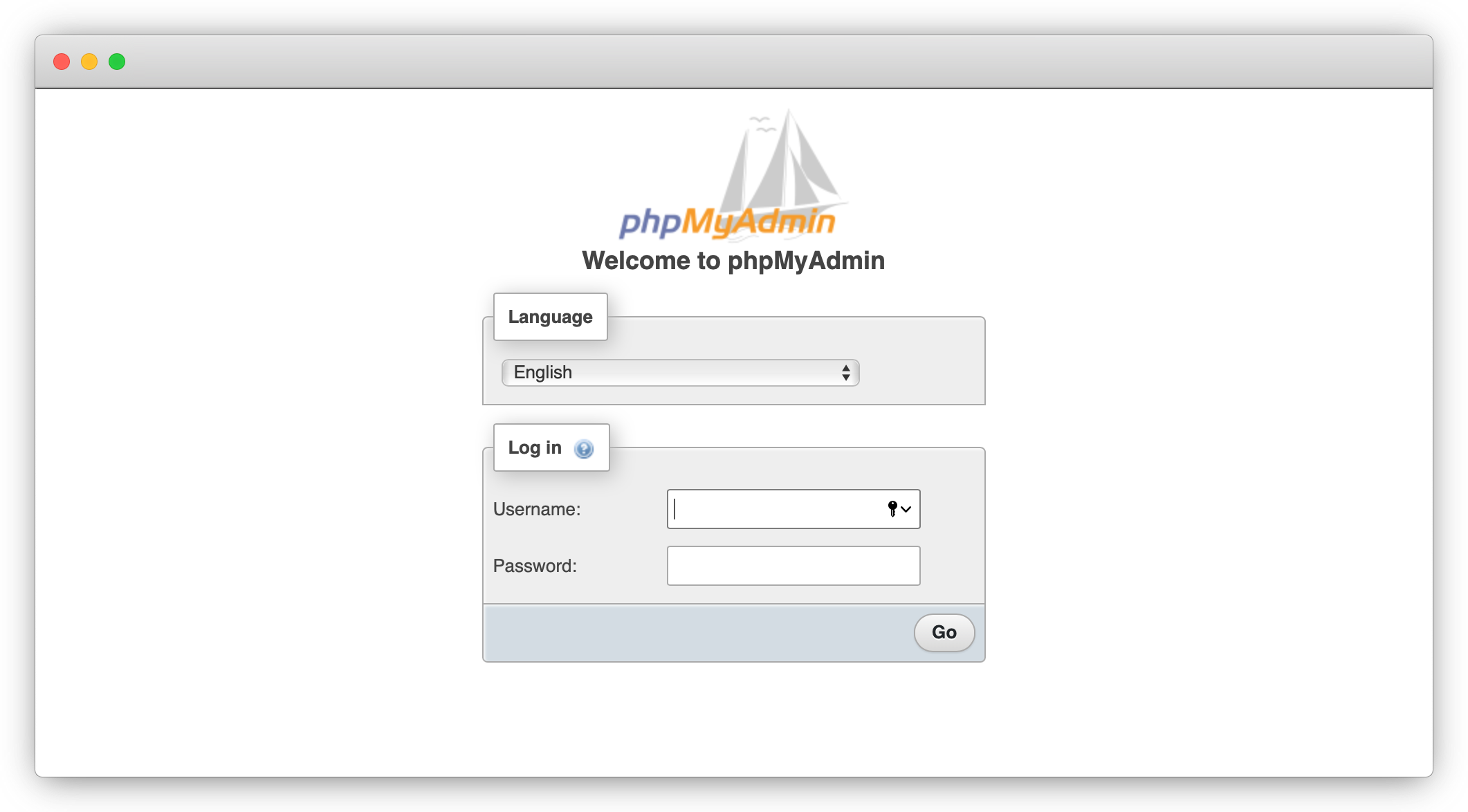Enter your MySQL credentials and click Go. The phpMyAdmin Dashboard displays: