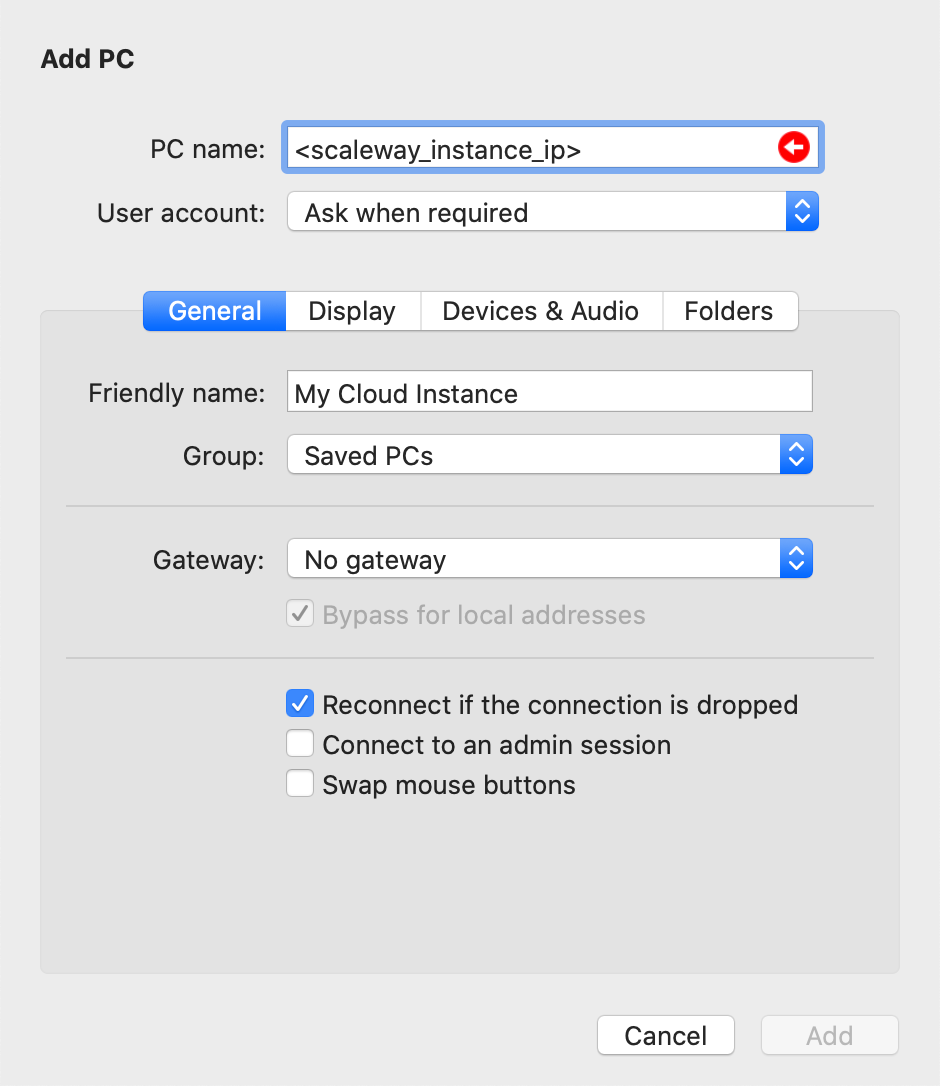 - Enter the connection details. You must enter at least your Instance's IP under PC name. Optionally, you can add a Friendly Name to facilitate the identification of your Instance in case you configure several RDP connections.