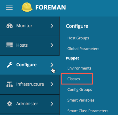 When connected to the Foreman web UI, click Configure> Puppet> Classes: