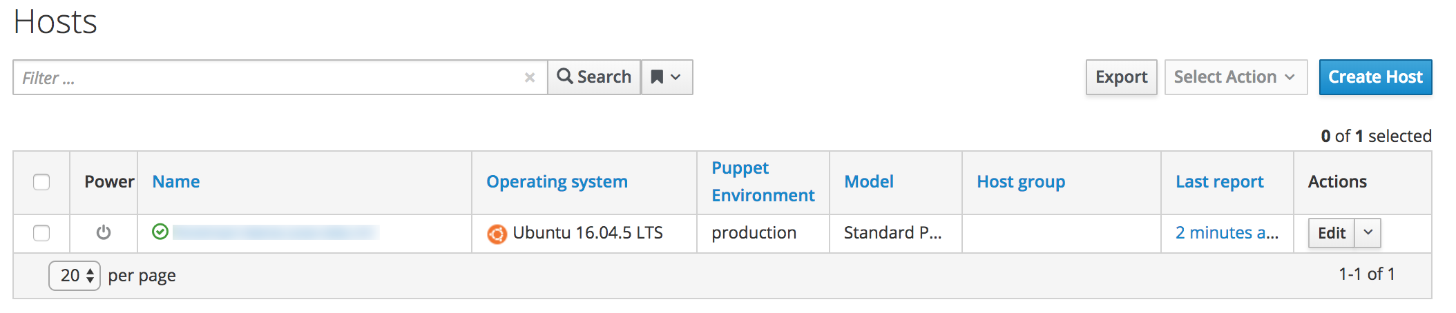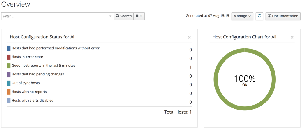 A summary of "Host Configuration Status" displays the amount of Puppet agent nodes and their statuses. Upon first connection, one single Instance should be visible in the "good host" section.