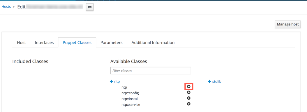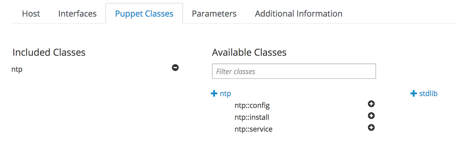 Click the Puppet Classes tab. Within the Available Classes section, click the ntp class, then click the plus sign next to "ntp":