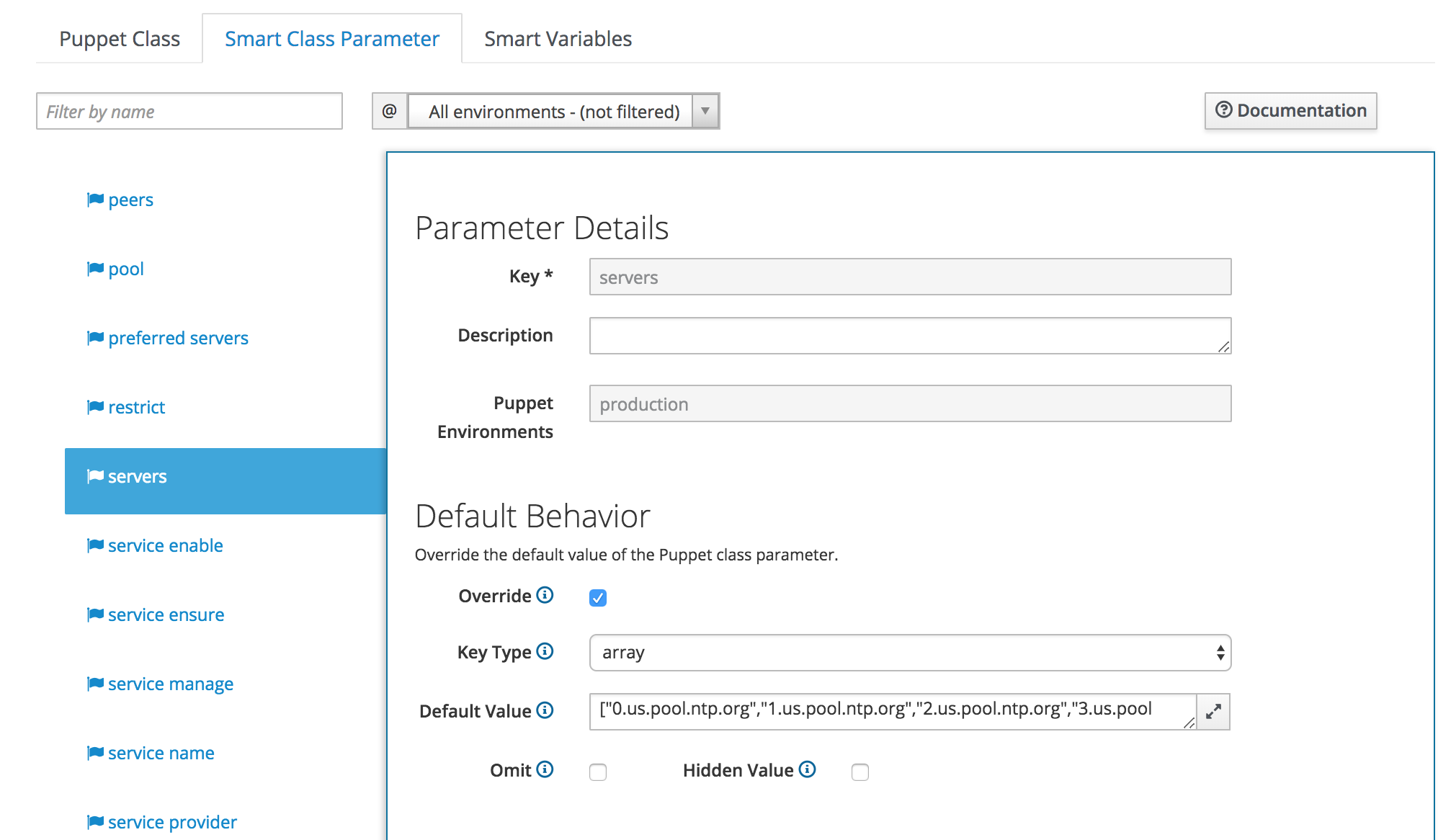 - Tick the Override checkbox. In the Parameter type menu, choose array and change the Default value from the default NTP pool to the desired one: