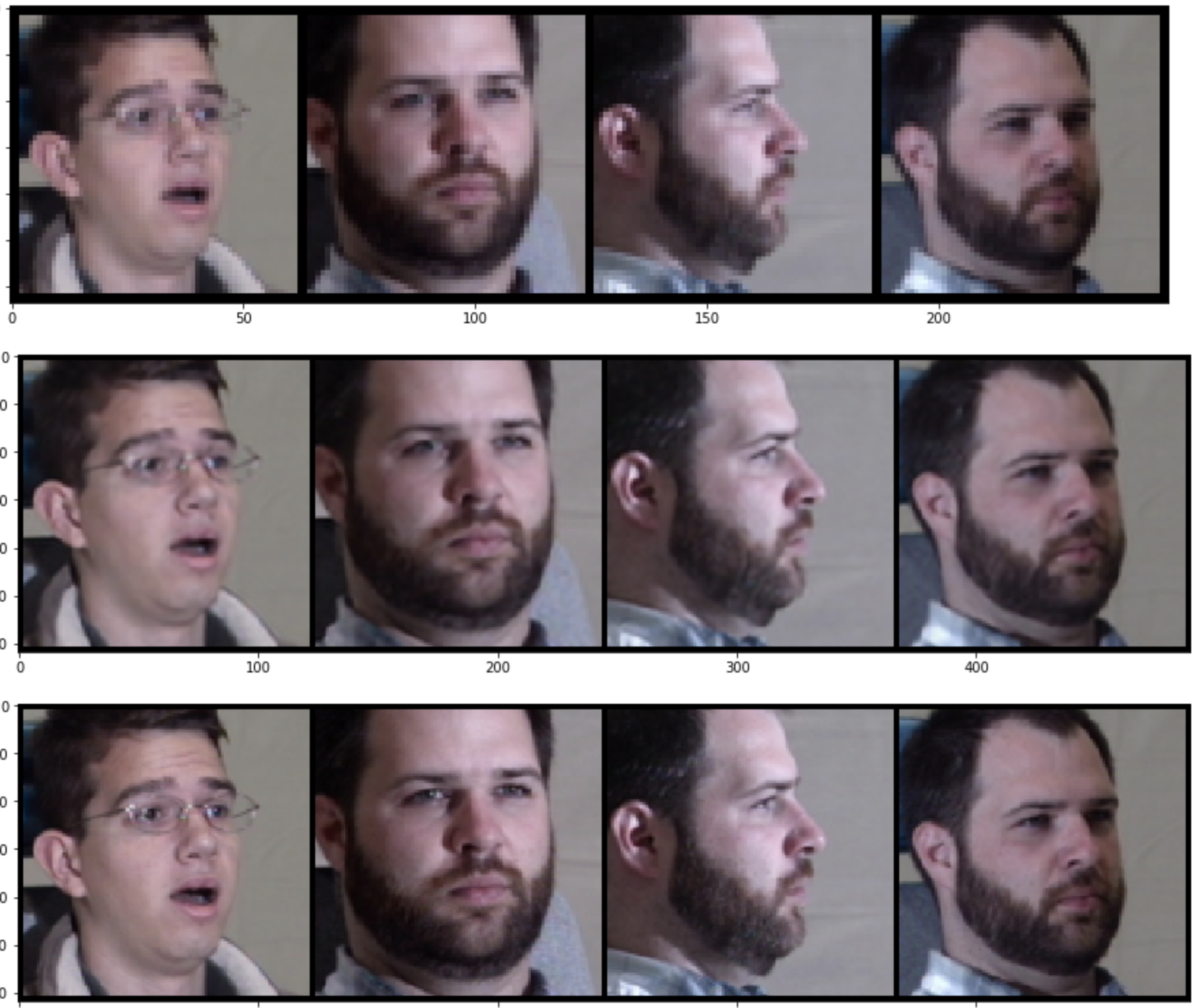 (the low res inputs, model's outputs, followed by the ground truth images)