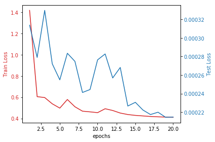 In the plot, you can see the train loss and test loss as a function of training epochs.