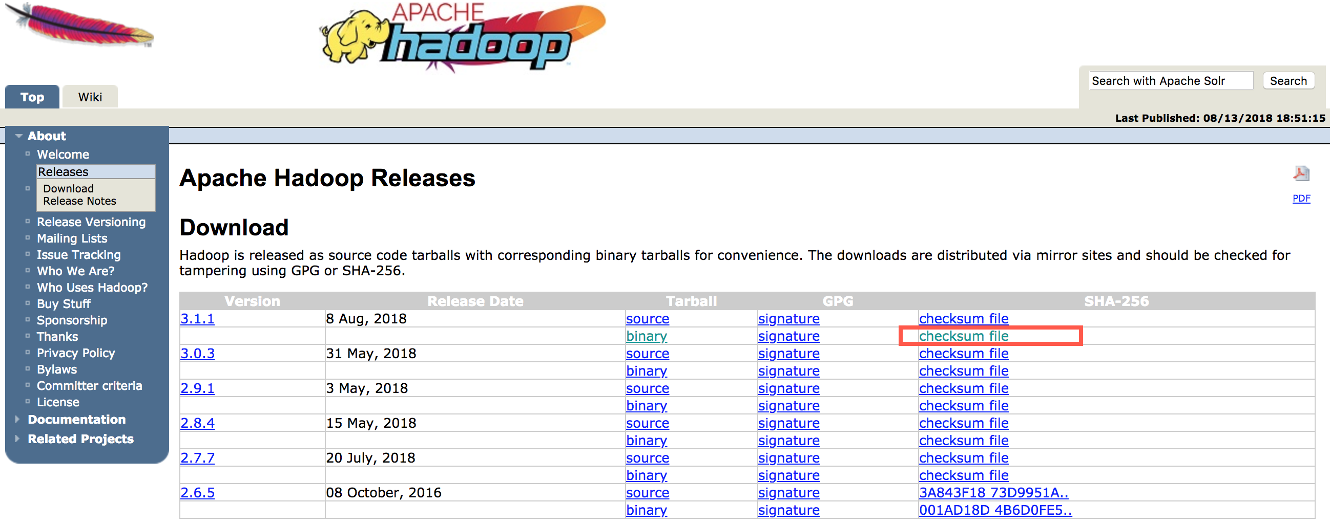 wgetto fetch it:wget https://dlcdn.apache.org/hadoop/common/hadoop-3.4.1/hadoop-3.4.1.tar.gzTo make sure that the file we downloaded has not been altered, we'll do a quick check using SHA-256. Return to the releases page, then click and copy the link to the checksum file for the release binary you downloaded: