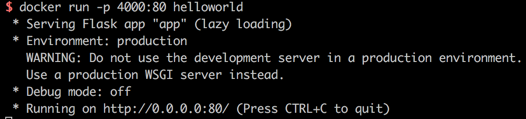 docker run -p 4000:80 helloworldYou will see a message similar to the following: