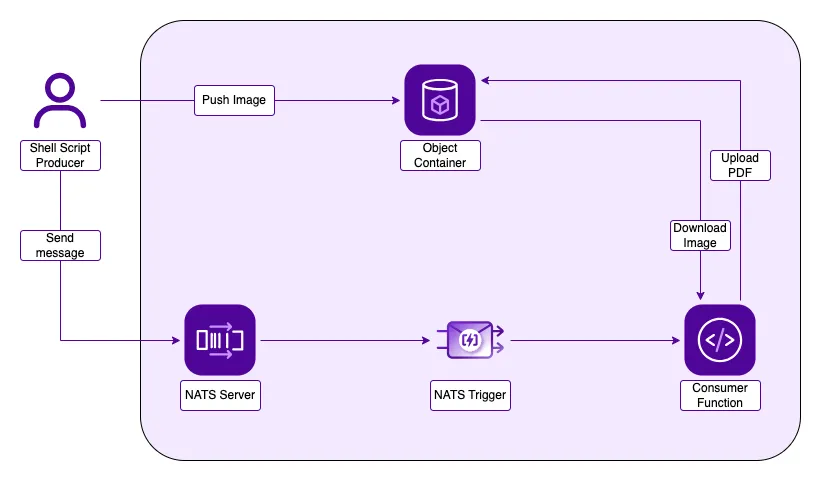 In this tutorial, we will build a simple architecture to store and automatically convert images to PDF. The focus is on transferring large messages using a messaging service, specifically the Scaleway NATS server. Our setup involves using the Object Storage service for image storage and the Serverless Functions service for conversion.