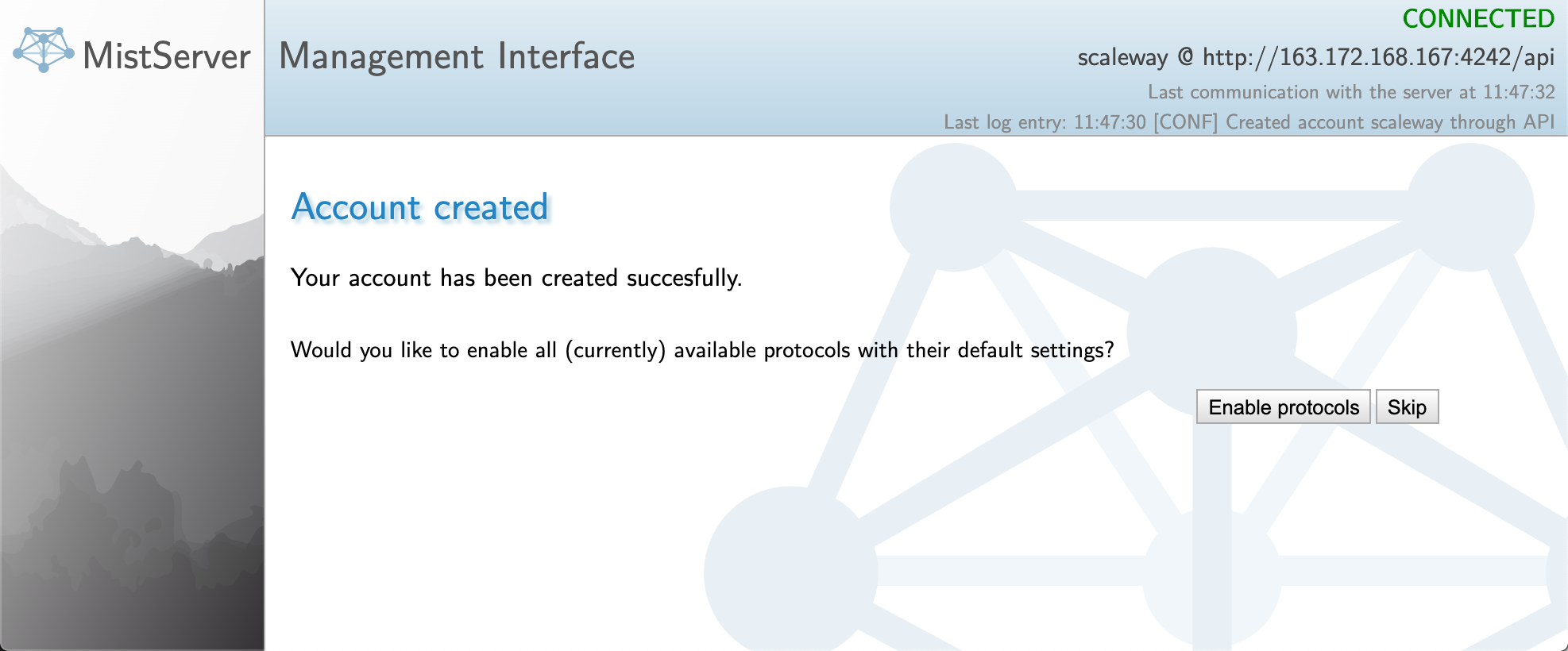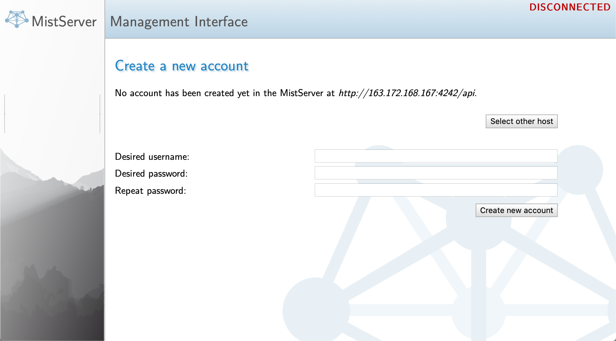 http://your.instance.ip.address:4242/(replaceyour.instance.ip.addresswith the IP of your Instance). The Mist Server configuration interface displays. - Enter your desired username, password, and its confirmation. Then click Create New Account.