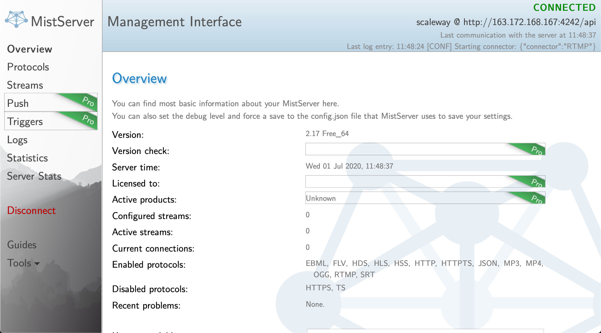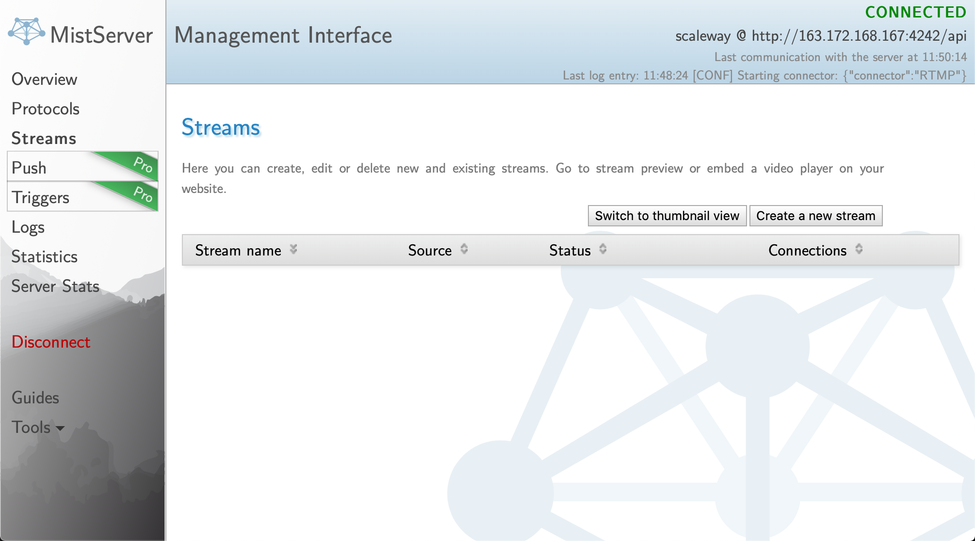The MistServer overview page displays. 4. Click Streams on the left menu to enter the stream section.