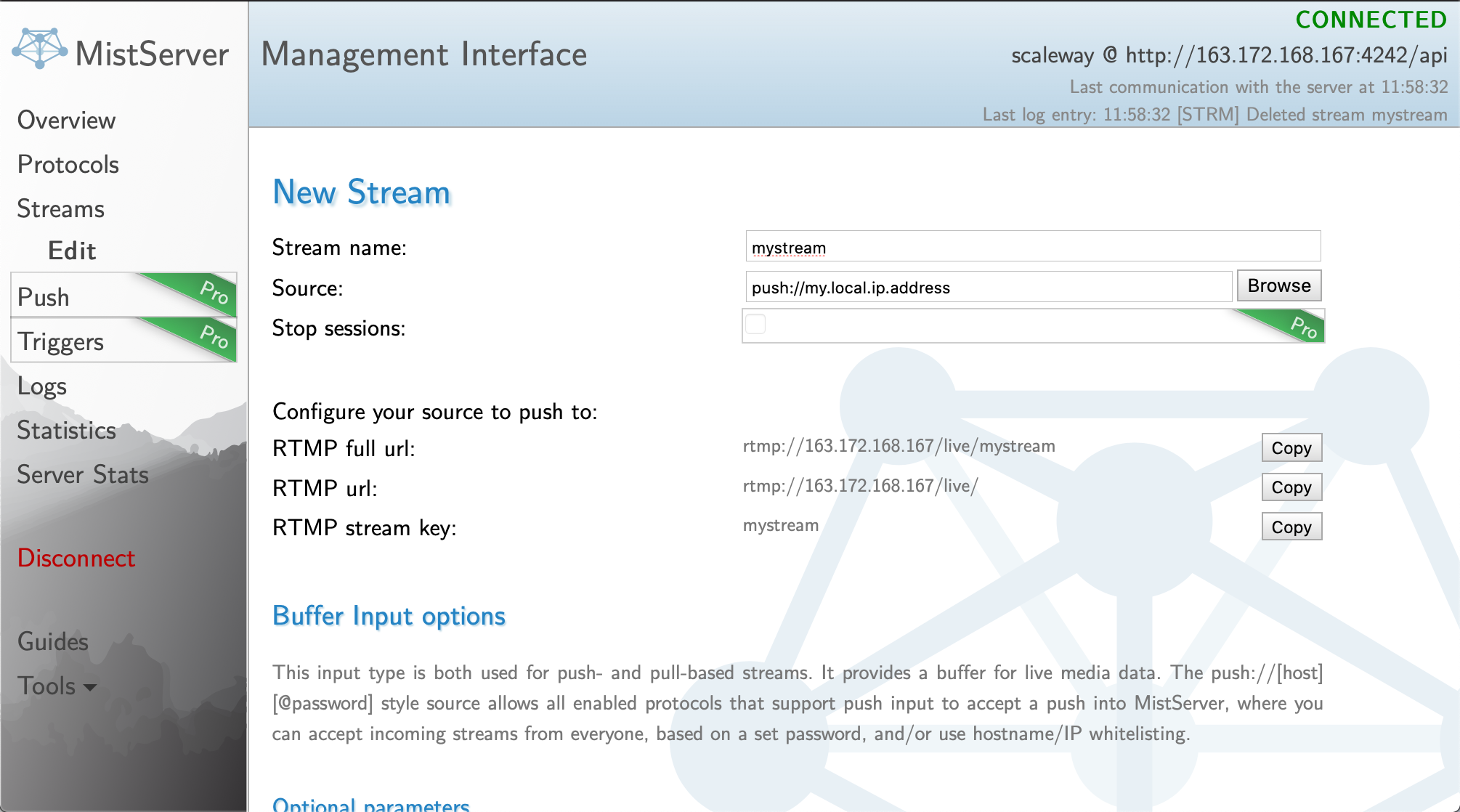 mystream. - Source: Enter the source of the stream. You can either stream local files from your Instance. Click Browse to select the content. To stream a live stream, enter the IP address of the source in the text box, e.g.