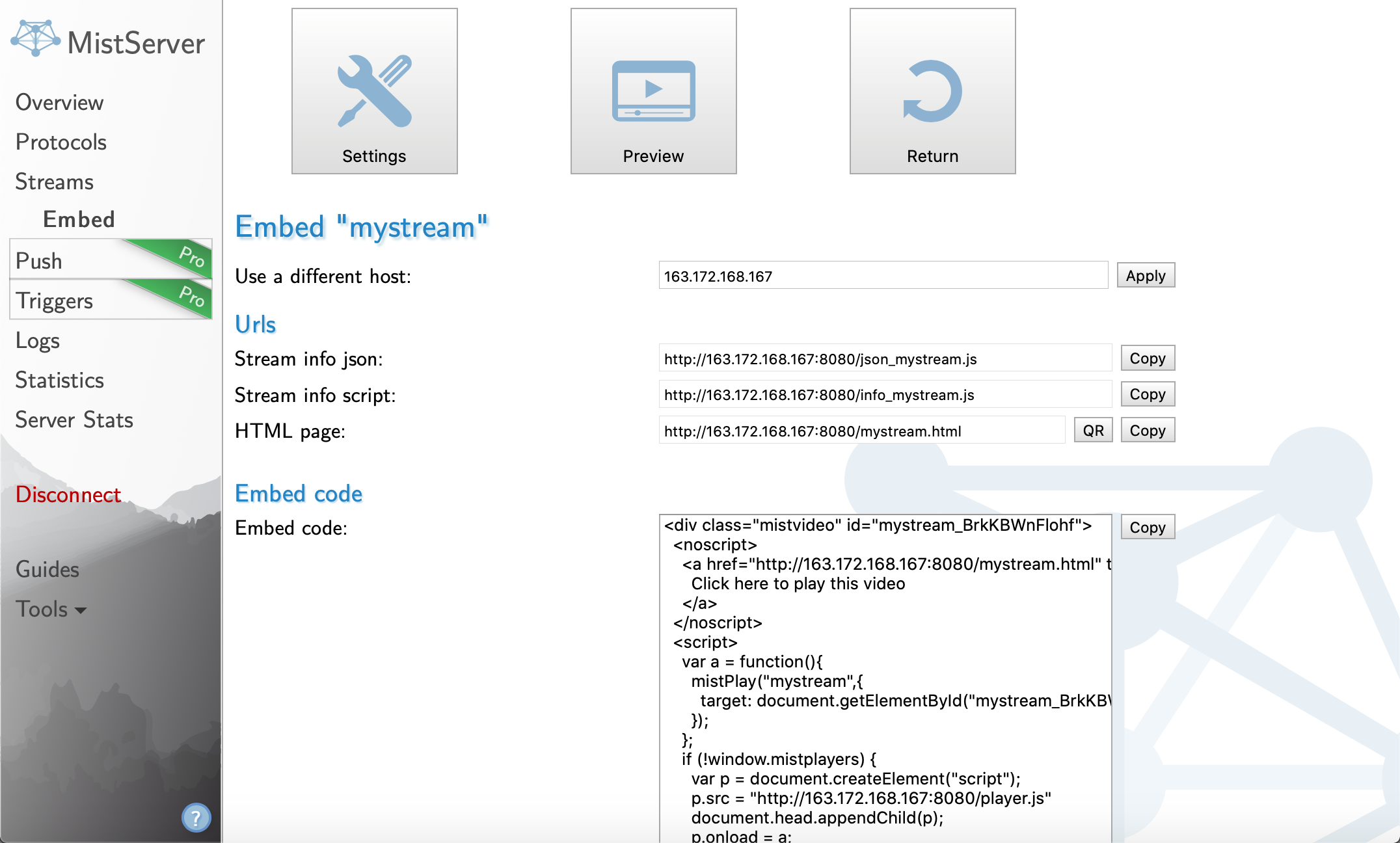 - Click Preview from the Streams list in MistServer to visualize a preview version of your stream.