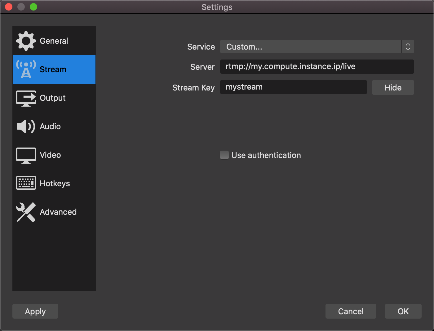 Customfrom the drop-down menu - Server Enter the stream URL of your Instance, for example: