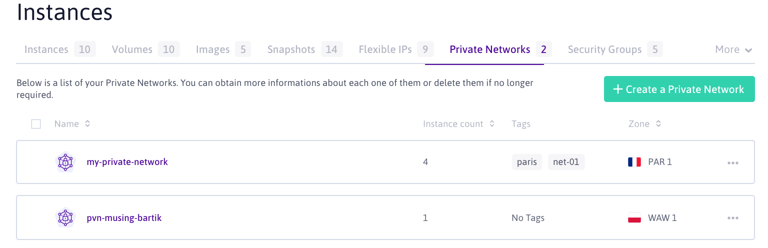 Private Networks are a LAN-like layer 2 Ethernet network. A new network interface with a unique MAC address is configured on each Instance in a Private Network. You can use this interface to communicate in a secure and isolated network, using private IP addresses of your choice.