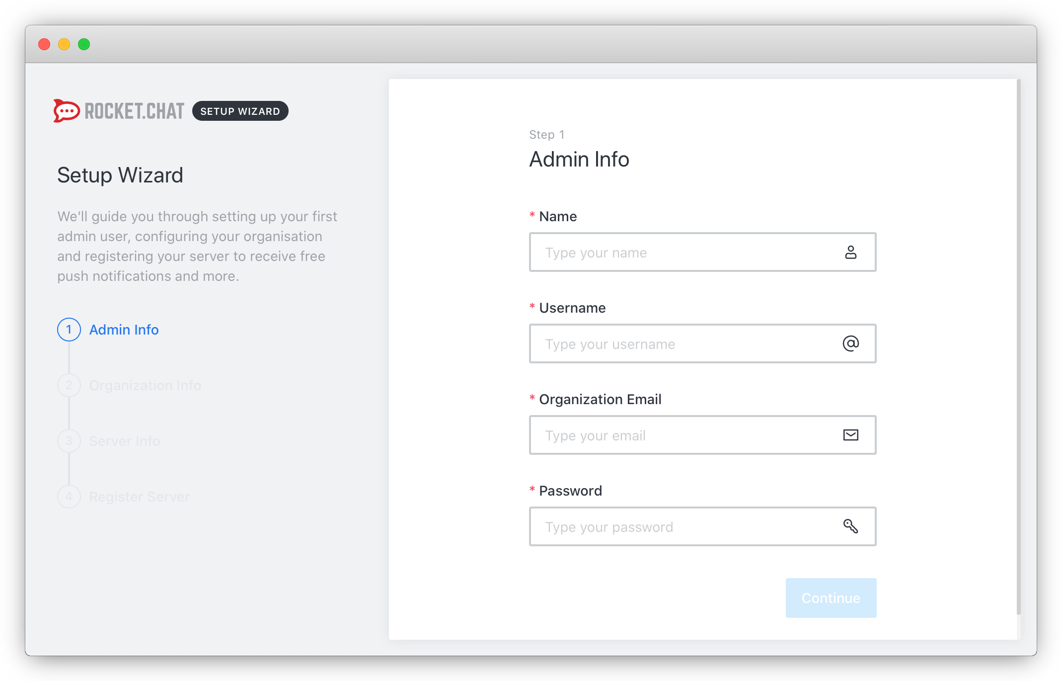 https://rocketchat.example.com). - The Rocket.Chat setup wizard displays. Enter your information for the admin account and click Continue to go to the next step: