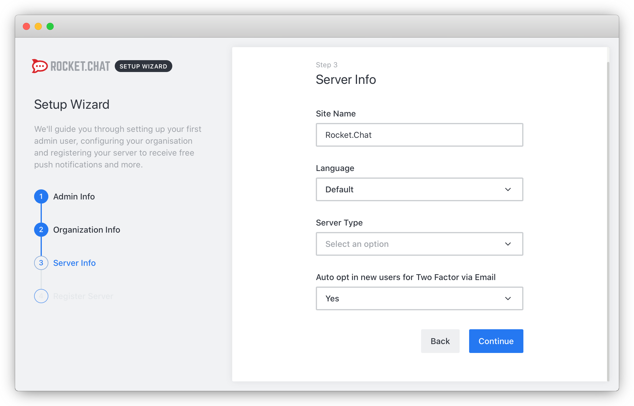 - Enter the details for your Rocket.Chat installation and confirm by clicking on Continue:
