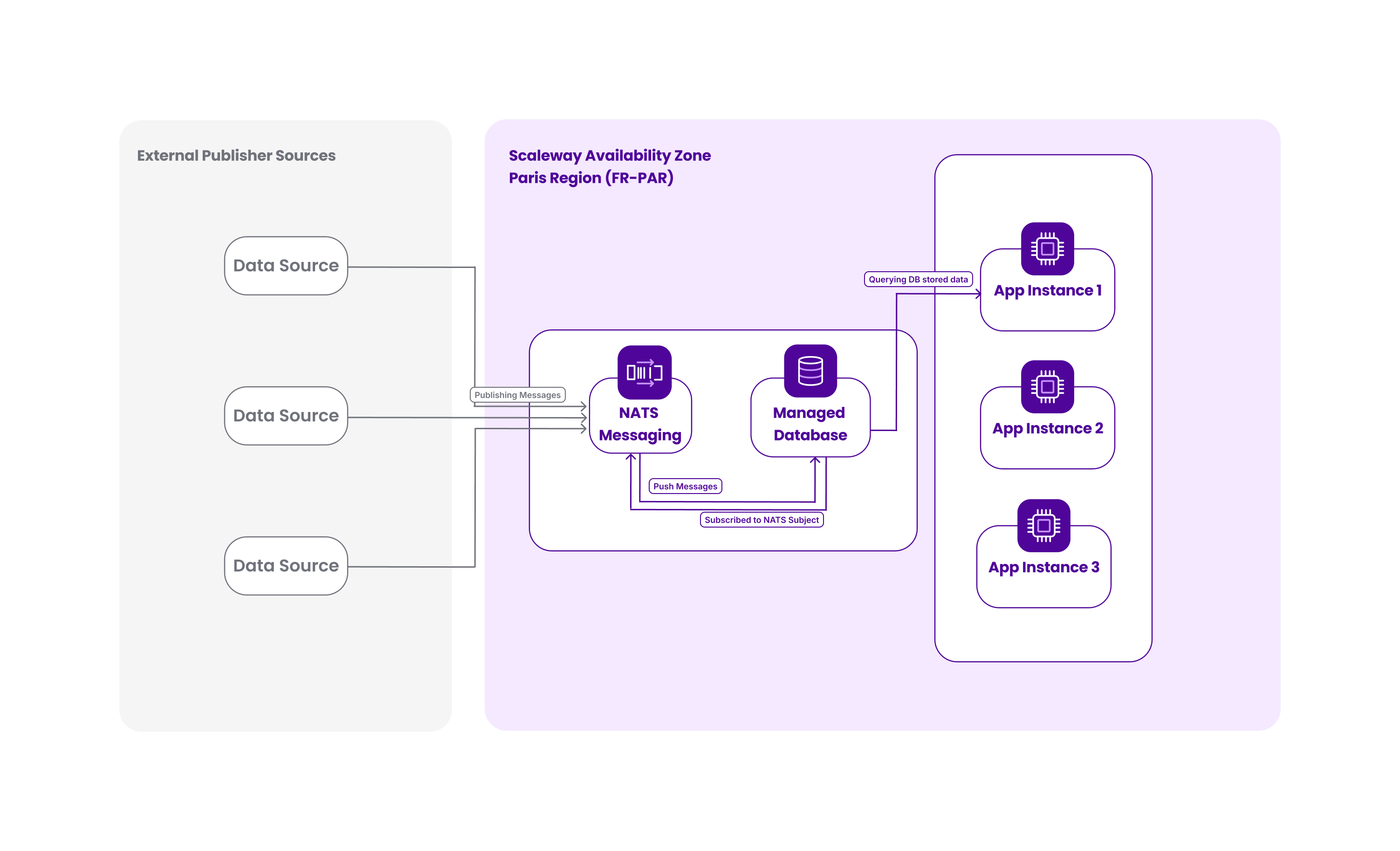 - A subscriber application that consumes messages published to the stream and then writes the data into a Scaleway Managed Database.