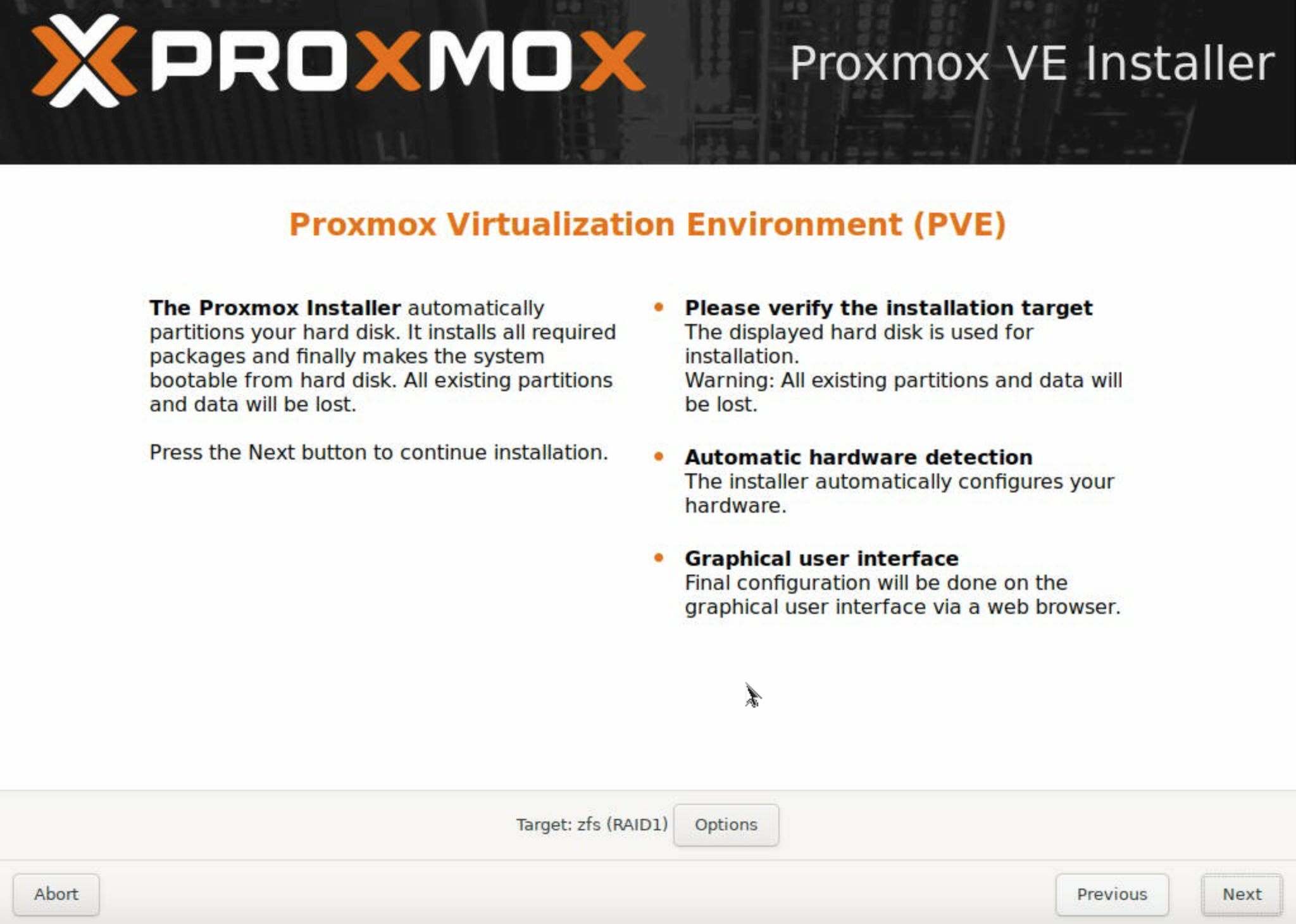 The Proxmox EULA displays. Agree to it by clicking I agree. A summary of the Proxmox installer displays.