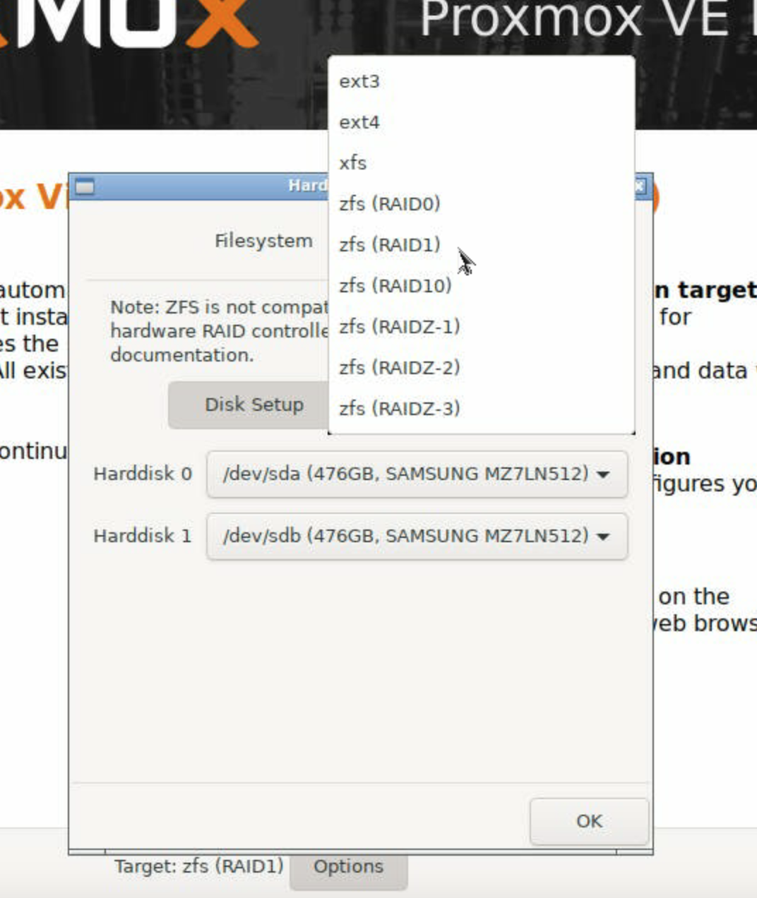 Choose the RAID level for Proxmox. To mirror the data on both drives, choose zfs (RAID1), then click Next to continue with the installation.