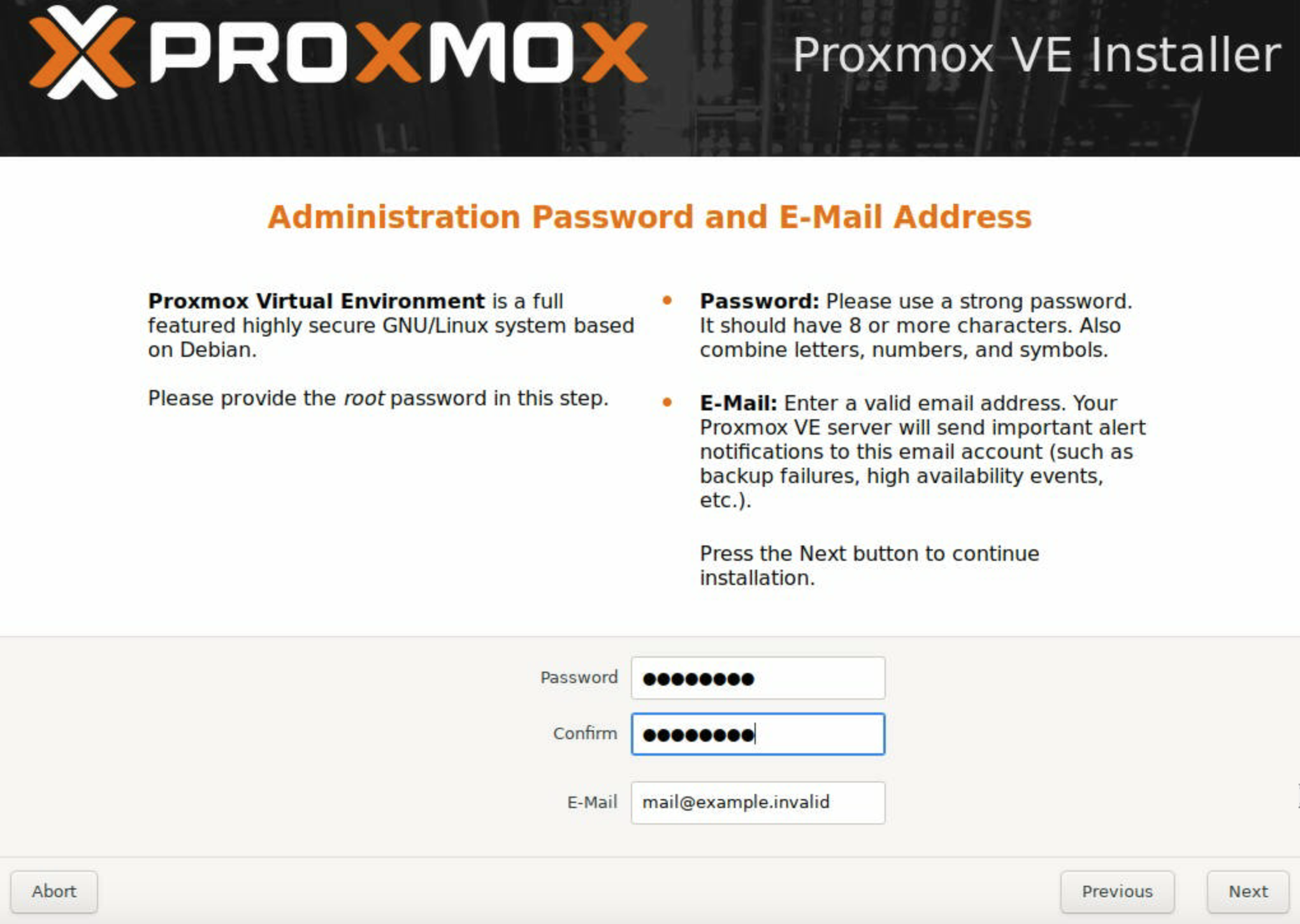 Enter a strong administration password with at least eight characters and its confirmation, and a contact email address. Proxmox will send important notifications to this email address, so make sure it is valid. Once all set, click Next.
