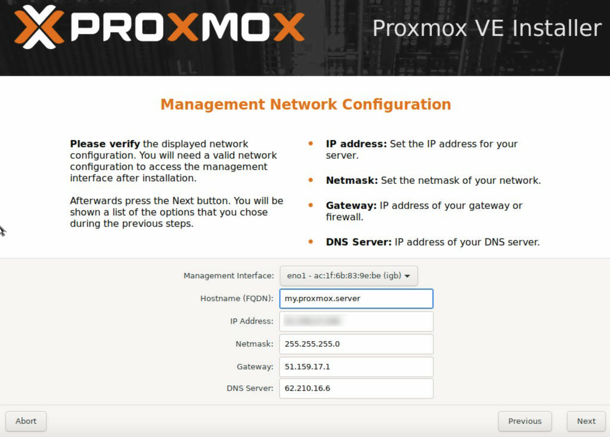 proxmox.mydomain.com) - IP Address: The main IP address of your Dedibox (i.e.