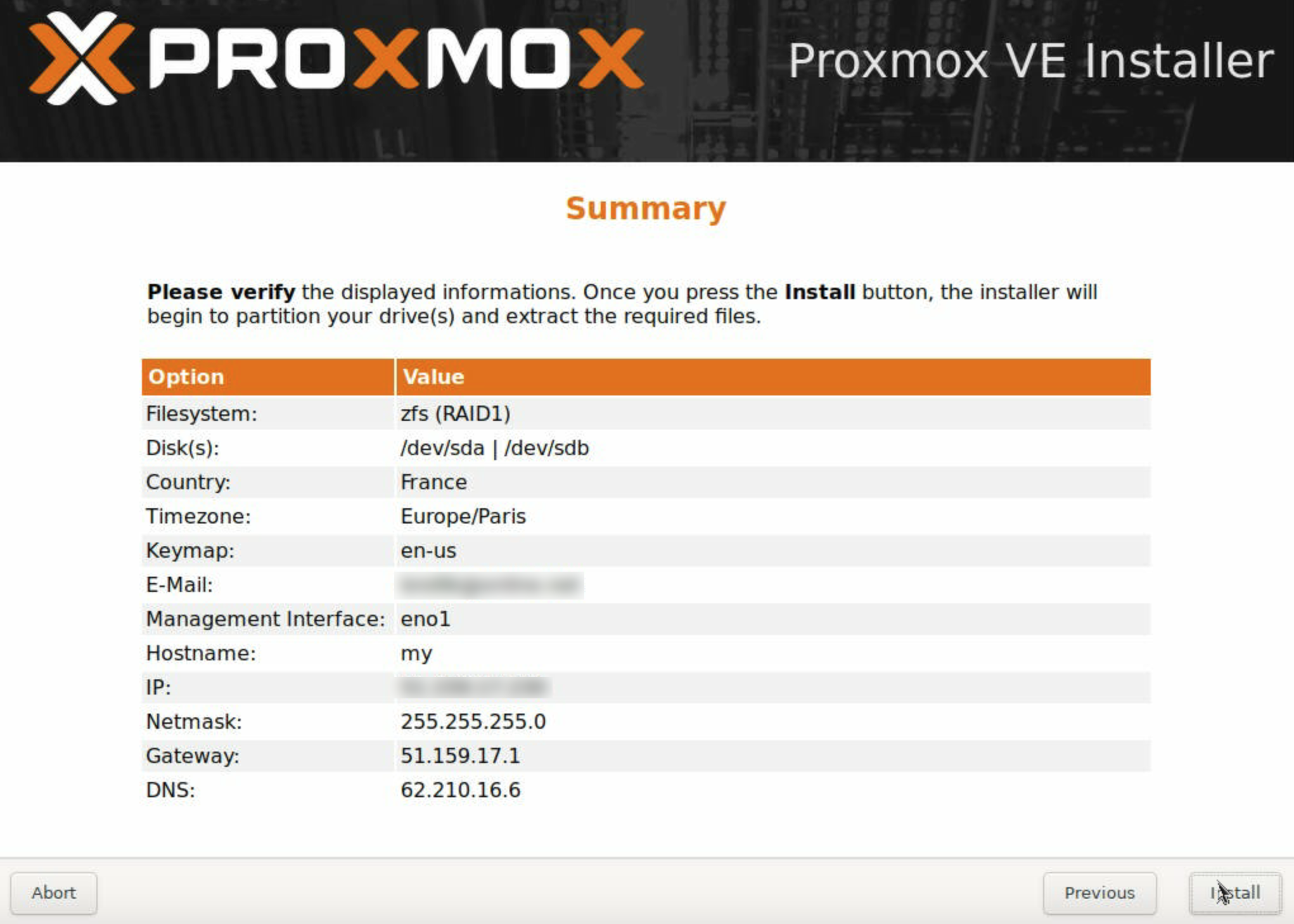 Configure the Management Network. This will be the network interface on which the Proxmox web interface and APIs are available. We recommend you configure it on the primary email address of your Dedibox.