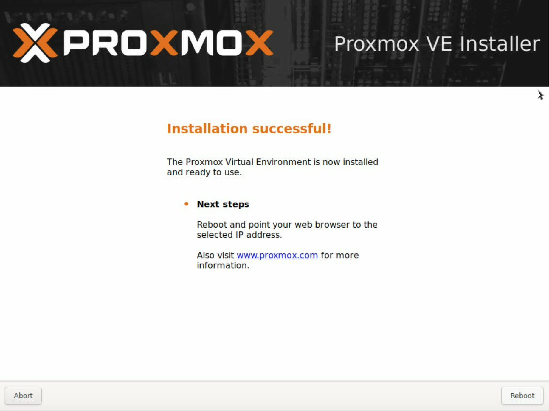 Once the installation is complete, a confirmation displays. 11. Click Reboot to reboot the server before accessing the Proxmox web interface: