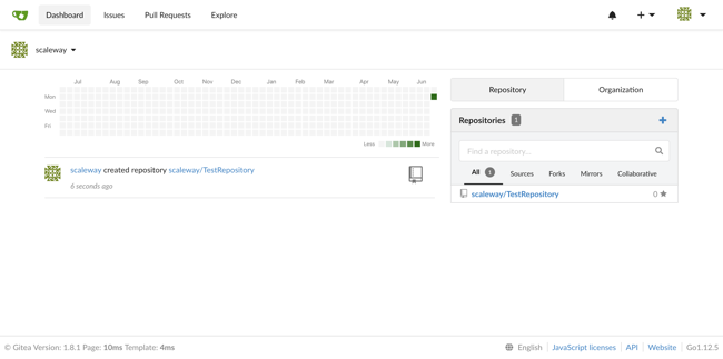 http://<your_instance_ip>:3000/user/sign_upin a web browser and fill in the required parameters. - Once the form has been submitted, you are logged into your Gitea account: