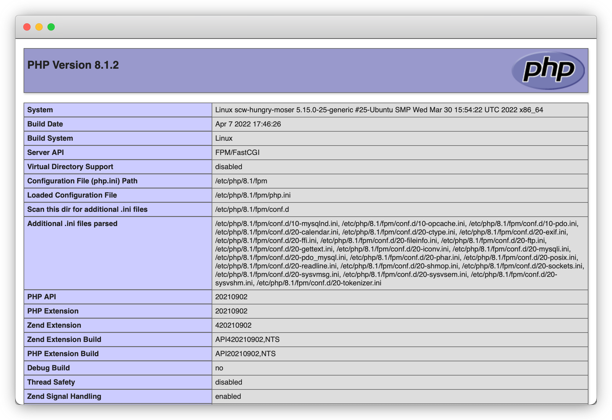 http://example.com/phpinfo.php(replacingexample.comwith your domain name). When you see an output like the following, it means PHP is set up correctly: