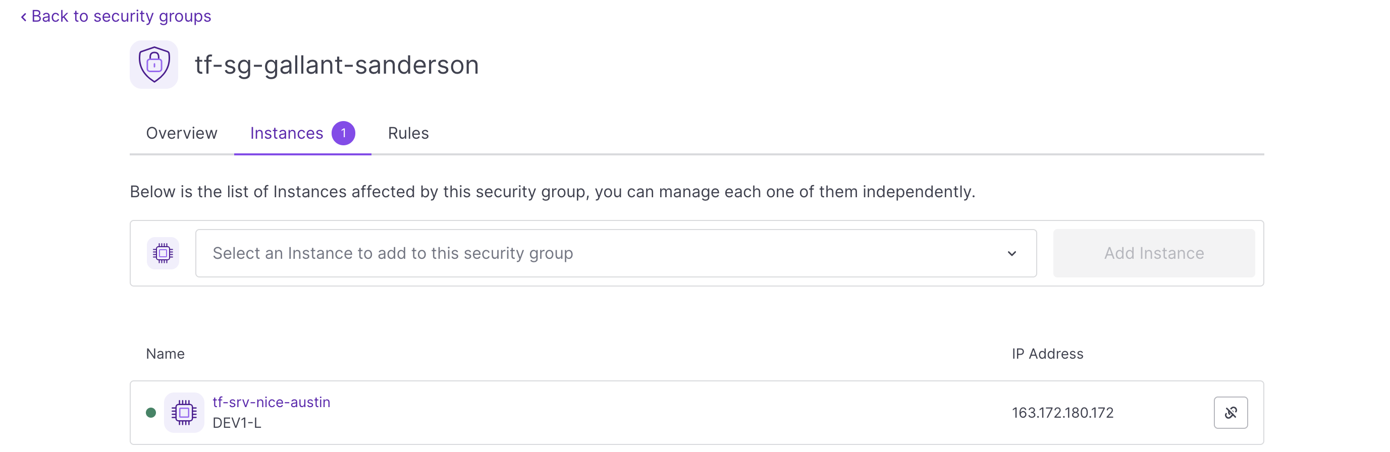 We now have a first Instance up and running. Next, we will modify it by restricting access using security groups. We are going to DROP all traffic to the Instance by default: only traffic to ports 80 (HTTP), 443 (HTTPS) and 22 (SSH) will be allowed. To do this, we have to add some more lines to our existing configuration file scaleway.tf.