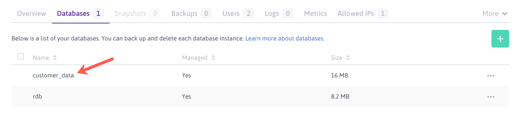 The database appears in the Managed Databases tab of your new Database Instance, once the backup has been imported: