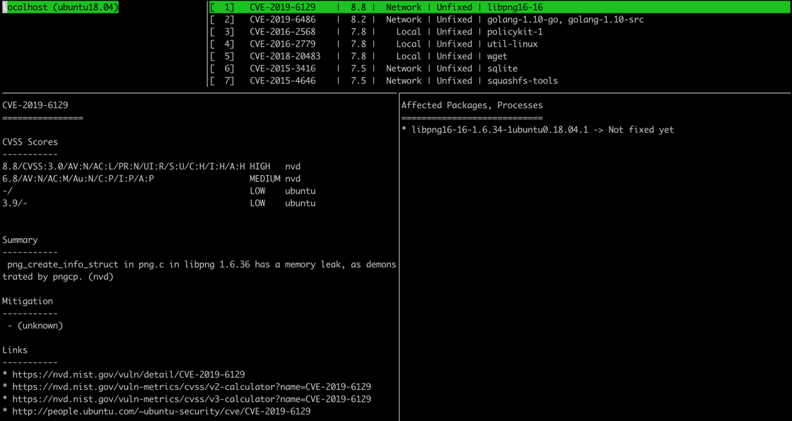 - Found vulnerabilities in the top right part, shows the list of vulnerabilities Vuls found in installed packages.