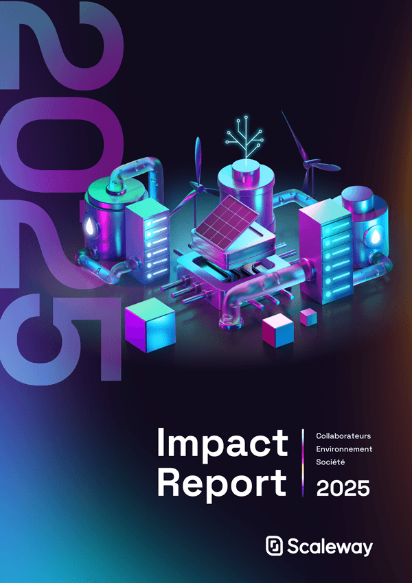 Download our latest Impact ReportEvery year, Scaleway reports transparently on key ESG indicators, covering our commitments to our People, to the Environment and to Society at large. Download our latest report to discover key indicators such as PUE+WUE (power and water usage effectiveness), CO2eq emissions (scopes 1, 2 & 3), hardware reuse, customer satisfaction ratings and staff diversity.