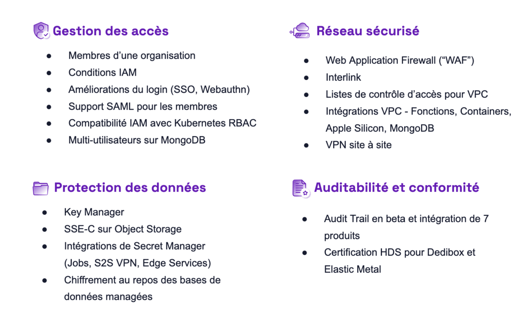 - Audit Trail en beta et intégration de 7 produits : suivez, dans un espace centralisé, qui a effectué quelle action dans votre Organisation. Les produits couverts incluent Kubernetes, Secret Manager, Apple Silicon et d’autres à venir. [Plus d’infos ici]