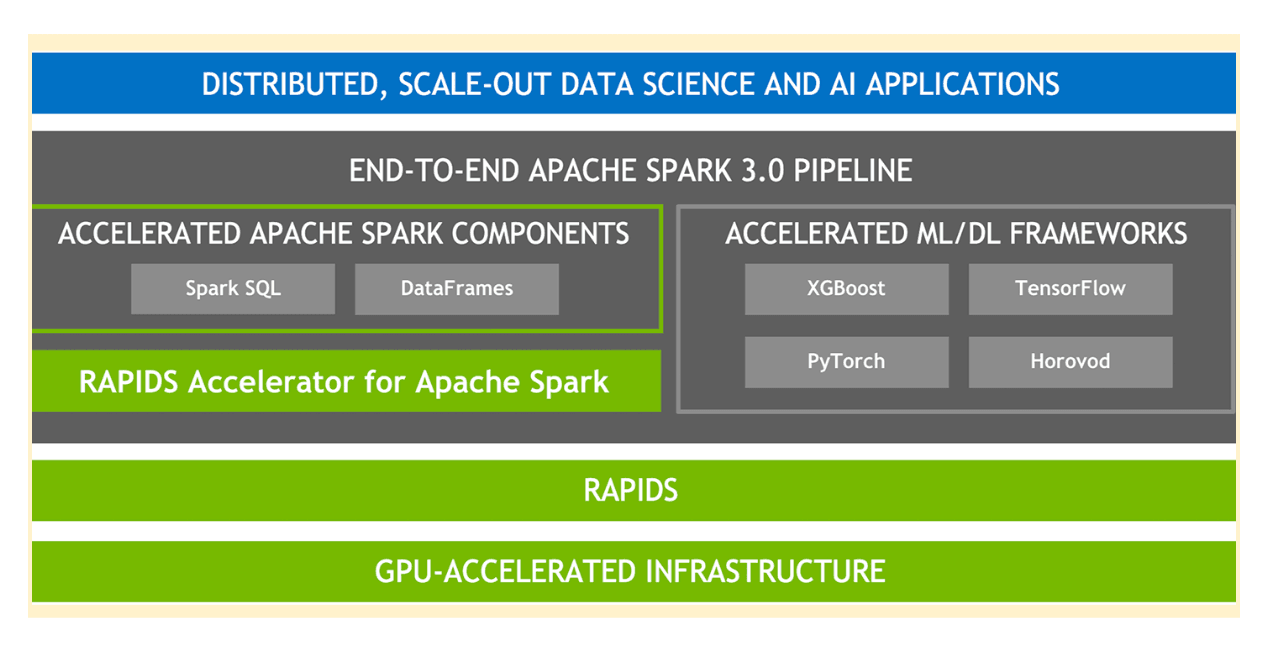 Le cadre de travail RAPIDS améliore les capacités d'Apache Spark™ en tirant parti de l'accélération par GPU. Développé par Nvidia et conçu pour s'intégrer avec Apache Spark™, RAPIDS offre des améliorations significatives des performances pour les tâches de traitement des données, ce qui peut entraîner des économies de coûts de jusqu'à 50% . Cela est particulièrement bénéfique pour la préparation, le nettoyage et le pré-traitement de jeux de données complexes qui sont mieux gérés par le matériel GPU.